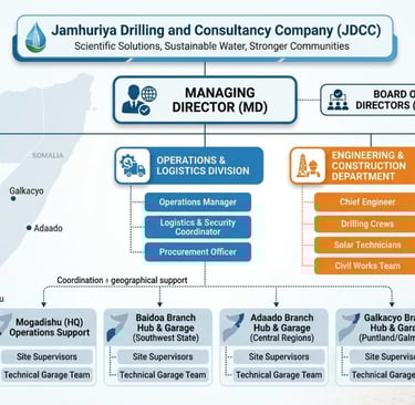 The defining strength of JADCO is our decentralized logistical network. While our Headquarters in Mogadishu serves as the central hub for administration and international procurement, our operational power is distributed across our regional branches and technical garages in Baidoa, Adaado, and Galkacyo. These are not merely administrative offices; they are fully functional maintenance hubs equipped with specialized mechanics, high-priority spare parts, and heavy-duty support vehicles. In the drilling industry, mechanical downtime is the primary cause of project delays. By maintaining a permanent presence in these regional capitals, we can deploy technical support to any site within our coverage area in a matter of hours, ensuring that project timelines are strictly met regardless of location.