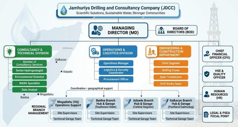 JADCO is led by a multi-disciplinary team of Somali professionals with decades of combined experience in hydrogeology, civil engineering, and international development. Our leadership structure is designed to bridge the gap between high-level consultancy and field-level execution.